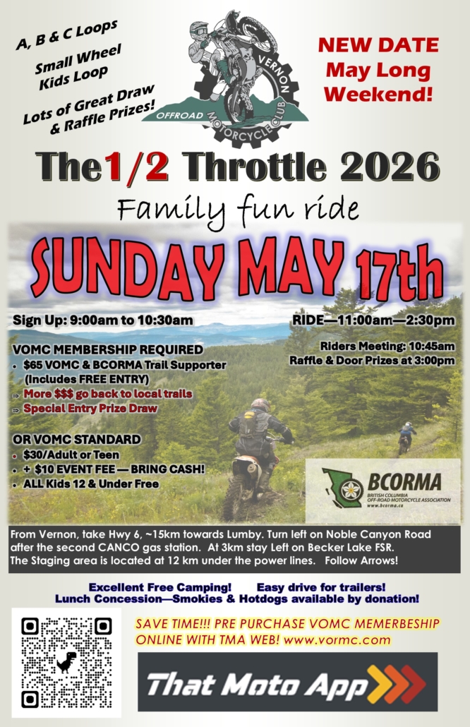 Seriously consider adding a BCORMA (BC Off Road Motorcycle Association) Trail Supporter for $65. A total of $35 will go to the VOMC and the rest is to help BCORMA advocate for us to the Province.